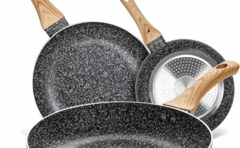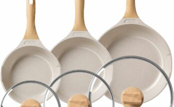 View on Amazon MICHELANGELO Non Stick Frying Pans – are a set of three useful kitchen tools. This set includes 8-inch, 9.5-inch, and 11-inch frying pans. They come in a …