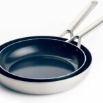 The Blue Diamond HD Stainless Steel Clad Pro 8″ Frypan Skillet is designed for even heating and durability with its stainless steel layers and aluminum core. It features a diamond-infused ceramic nonstick surface that is free of PFAS and PFOA and is claimed to be metal utensil safe, although some users have reported food sticking. The pan is also dishwasher, oven, and broiler safe. However, some customers have noted that the non-stick quality may decrease over time, and there have been reports of quality issues and potential false advertising regarding its non-stick capabilities, with low to medium heat being generally advised for use. Read more…