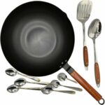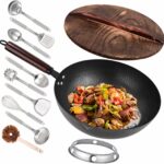 This BrBrGo wok set has a 13-inch pan made of strong carbon steel with a flat bottom for all stoves and no chemical coating. It’s easy to handle and can cook for up to six people. The set includes a wooden lid, a spatula, and chopsticks. This durable pan is designed for authentic Chinese cooking and stir-frying.