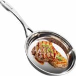 This Duxtop 9.5-inch stir fry pan is made with stainless steel and has a ceramic non-stick coating that is reinforced with titanium, meaning you can use less oil when cooking. It has a thick bottom that helps heat spread evenly and works on all kinds of stoves, including induction. The pan is easy to clean and safe to put in the oven, dishwasher, and freezer. However, the non-stick might wear off over time, and food could stick. Some people might find it hard to clean if food does stick, and oil might not spread evenly. It doesn’t come with a lid, the handle might feel cheap, and some users have reported uneven heating or issues with the coating. The price might be high for some, and the long handle could be awkward to use. Read more…