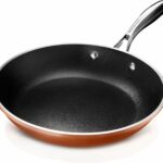 This Gotham Steel 10-inch frying pan is made with a non-stick ceramic coating, so food should slide off easily and you can cook with less oil. It’s safe to use in the oven and dishwasher, and it doesn’t have toxic chemicals. The pan is designed to heat evenly and has a handle that stays cool to the touch. However, the non-stick might wear out over time, and metal tools could scratch it. \