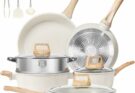 This large, cream navy Gotham Steel 14-inch non-stick frying pan is designed for families and offers easy cooking with its non-stick surface and induction-ready base. It’s oven and dishwasher safe, and its skillet style makes it versatile for various meals. However, the large size can be hard to handle and may not fit in all spaces, the light color can stain, and the paint might chip. Also, the handle can get hot, heat distribution may sometimes be uneven, and the surface could scratch easily, suggesting it may not always be very durable. Read more…