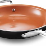This Gotham Steel Copper Cast frying pan set includes three nonstick copper fry pans in 8, 10, and 12-inch sizes, suitable for making omelets and other dishes. The pans are PFOA-free, dishwasher safe, and feature cool-touch handles for easy and safe use. While advertised as easy to clean and durable, some users have reported issues with food sticking, the handle feeling less sturdy, the coating potentially scratching, uneven heating, and cleaning difficulties due to bottom ridges, which may affect the pans’ long-term durability and consistent non-stick performance. Quality can also vary between individual pans. Read more…