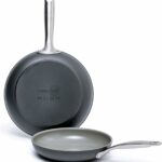 This GreenPan Chatham 8-inch frying pan is made with three layers of stainless steel for good heat and a non-stick coating that’s healthy because it’s made without harmful chemicals. It can be used on all kinds of stoves, even the ones that use magnets (induction), and you can wash it in the dishwasher. It’s strong and can handle metal spoons, plus you can put it in the oven up to 600 degrees. However, some people have found that it doesn’t stay non-stick for very long, might not be as tough as they hoped, and could get scratched. Using metal tools might not be the best idea, and it can cost more than other pans. The bottom for induction stoves is a bit bumpy, and the handle can get hot. Also, the non-stick layer might chip off over time. Read more…
