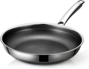 - ✅ [DURABLE TRI-PlY STAINLESS STEEL]: Made from top-grade stainless steel, our pan is built for long-lasting performance. The non-toxic surface ensures a safe and efficient cooking experience. Suitable for all stovetop types, including gas, electric, glass, and halogen,this frying pans nonstick is a versatile addition to any kitchen.