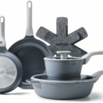 The MICHELANGELO 10-piece pots and pans set is a durable and easy-to-clean cookware collection with a stylish white granite nonstick surface. This set includes both pots and pans, along with useful kitchen utensils. The nonstick coating helps food slide off easily and makes cleanup simple. The white granite design gives the cookware a nice look, making it a practical and attractive addition to any kitchen.