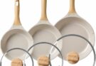 Such ceramic pans are great for the healthy meal cooking because they require less oil or fat. At the same time, you enjoy great peace of mind too because it is free from various harmful chemicals such as PFAS, PFOA, lead and cadmium. The users get good searing and even cooking result because it features 4mm aluminum base, which is very good because it is helpful to heat the food evenly as it is good for the even heat distribution. And, the exterior is very durable too. It has the hard-anodized exterior, so it is quite easy to clean and maintain.