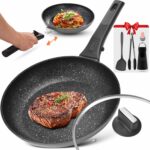 This Royal Tag 12.5-inch carbon steel wok has a flat bottom, making it suitable for induction, electric, gas, and halogen stoves, and is designed for stir-frying with a nonstick surface. It comes with both a glass and a wooden lid. However, some users have reported that the nonstick surface can feel a bit sticky, the color may fade over time, and it might not be the best choice for experienced cooks. There are also concerns about the handle’s durability, the wooden lid possibly splintering, and uneven heating. Some find it a bit awkward to hold. Overall, while it’s a decent option for beginners, it may not last for a very long time. Read more…